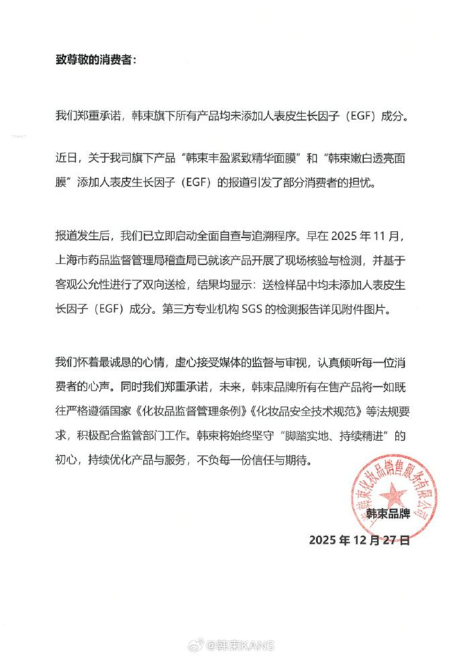 此外据南方都市报报道,韩束透露,此前上海市药品监督管理局稽查局,已就这两款产品开展了现场核验与检测,同时为客观公允性,公司与市药监局进行了双向送检,结果均显示:送检样品中均未添加表皮生长因子成分。对于央视报道中提及的产品,他们会再次送检,届时公布检测结果。同时,韩束方面表示:“在报道播出后的第一时间,我司已立即启动全面自查程序,展开相关情况的核查与追溯工作。”