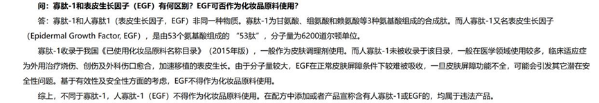 值得关注的是,此次并非化妆品行业首次因EGF成分引发争议。此前,其他品牌也曾被指涉嫌添加该违禁成分,并出示检测报告以自证。根据国家药监局2019年发布的解读,在化妆品中添加或宣传含有人寡肽-1(即EGF)均属违规行为。
