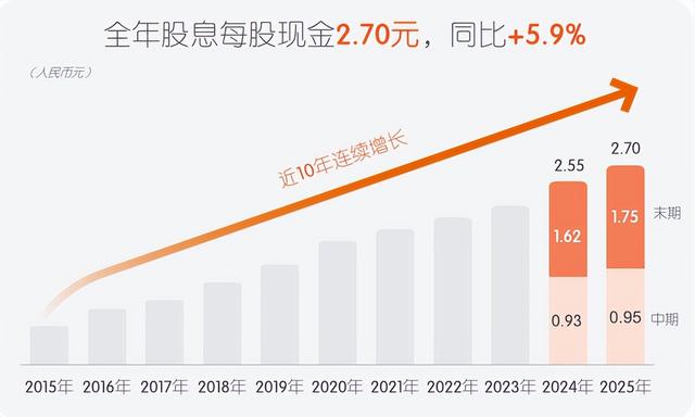 中国平安也用实际行动,诠释了与投资者价值共创的理念。根据利润分配方案,公司拟派发2025年末期股息每股现金人民币1.75元(含税),叠加已派发的中期股息,全年股息达到每股现金人民币2.70元(含税),同比增长5.9%,全年现金分红总额高达488.91亿元。