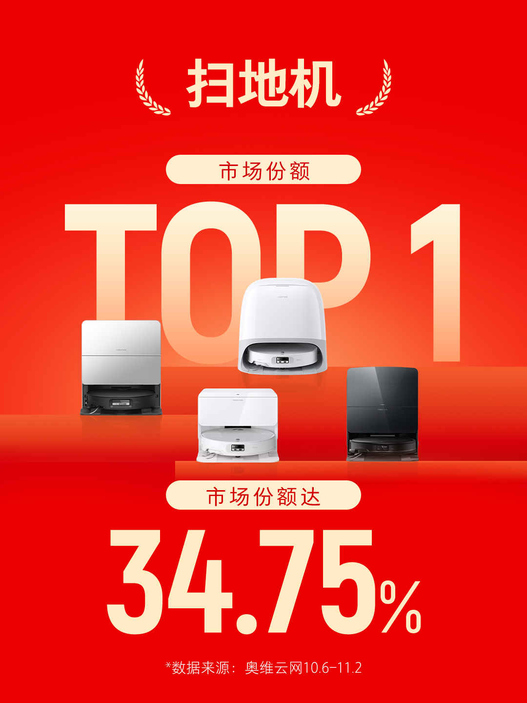 官方战报显示,石头科技扫地机市场份额高达34.75%,稳居全网第一,公司主推产品P20 Ultra Plus更是全方位登顶“京东扫地机销售榜TOP1,双11京东品质小家电金榜,天猫双11生活电器超级必买榜&扫地机器人热卖榜&扫地机器人好评榜TOP1”。