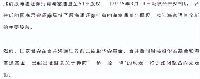 此外,据《不慌财说》报道,随着国泰君安证券合并海通证券,同时控股华安基金和海富通基金,已超出证监会关于券商“一参一控一牌”的规定,未来如何整合尚无定论。这一股权结构的调整,也为海富通基金的未来增加了不确定性。