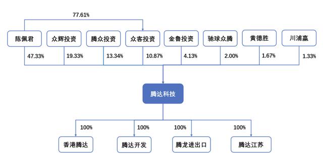 本次上市前,腾达科技的控股股东、实际控制人为陈佩君。截至招股书签署日,陈佩君直接持有该公司7100万股,占该公司现有总股本的比例为47.33%,为该公司控股股东。目前,陈佩君为腾达科技董事长。