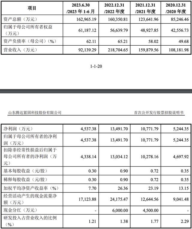 2020年、2021年、2022年和2023年上半年,腾达科技的营收分别为10.82亿元、15.99亿元、21.87亿元和9.21亿元,净利润分别为5244.35万元、1.08亿元、1.35亿元和4537.38万元,扣非后净利润分别为4697.92万元、1.03亿元、1.30亿元和4338.14万元。