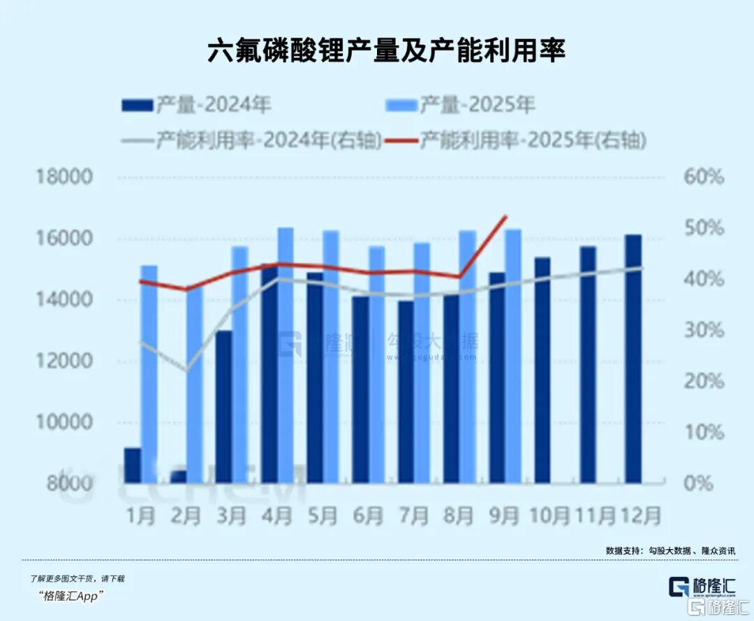 百川盈孚数据显示,截至10月10日,六氟磷酸锂库存仅1500吨,处于2019年以来35%的分位数,属于“低位库存”状态,部分企业甚至“零库存”运营。隆众资讯数据显示,9月我国六氟磷酸锂产量2.18万吨,环比增34.14%、同比增46.29%,产能利用率提升至52.3%。但10月产量预计降至2.01万吨,环比跌3.4%。