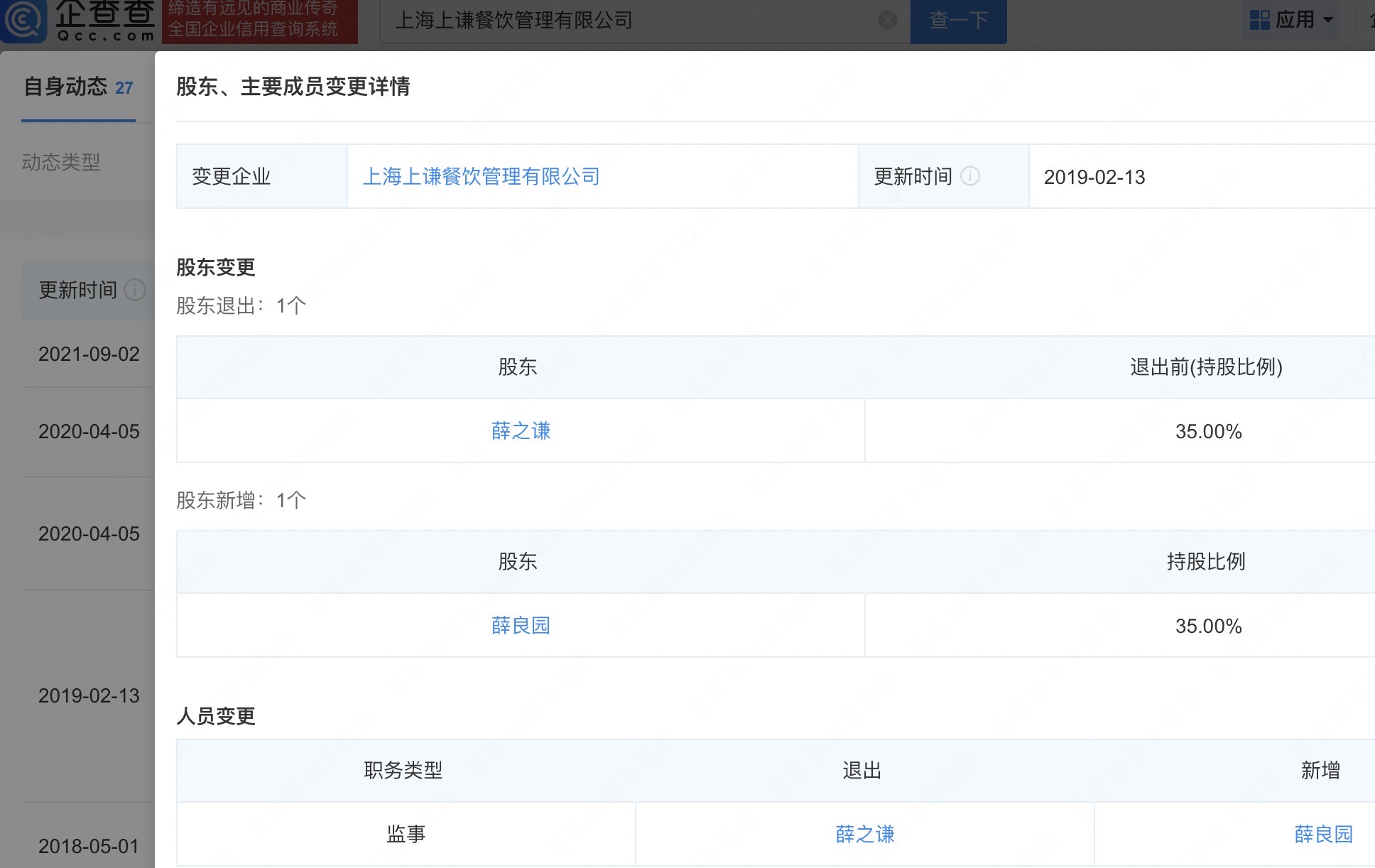 企查查APP显示,上海上谦餐饮管理有限公司成立于2012年,法定代表人为李渊林,经营范围为餐饮服务、餐饮企业管理,由李渊林、薛良园共同持股。值得注意的是,该公司已于2021年9月注销。变更记录显示,2019年2月,薛之谦退出该公司股东,其父薛良园入股。