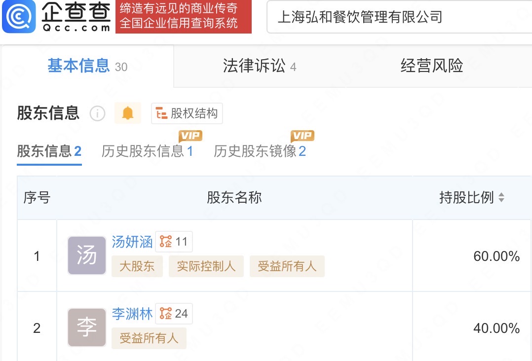 此外,上上谦火锅上海店关联公司上海弘和餐饮管理有限公司成立于2019年,法定代表人为李渊林,由汤妍涵、李渊林共同持股,该公司目前为存续状态。
