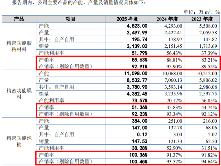 同样,根据招股书披露,核心产品精密功能泡棉2023年至2025年产量分别为68.06万㎡、132.78万㎡、147.00万㎡,自产自用数量分别为2.02万㎡、3.04万㎡、0.12万㎡,对外销售数量分别为62.50万㎡、121.33万㎡、147.53万㎡。由此可知,产销率(剔除自用数量)实际为91.83%、91.38%、100.36%,但是公司招股书披露产销率(剔除自用数量)分别为94.64%、93.52%、100.45%。虽然误差幅度相对较小,但披露值与计算值不一致的问题依然存在。