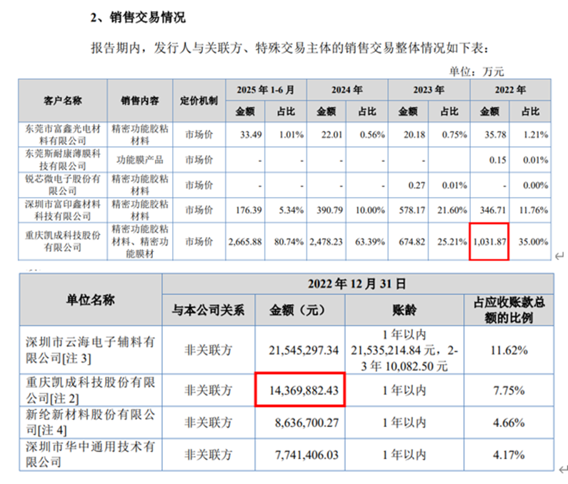 与此同时,数据显示,2025年公司对重庆凯成的销售额较2024年大幅增长2601.41万元,达到5079.64万元,而富印新材2025年全年营业收入总额较2024年的增长额仅为3533.54万元。也就是说,富印新材2025年业绩增长的73.62%,直接源于对关联方重庆凯成的销售贡献。这种高度绑定单一关联方的增长模式,让公司业务独立性遭受严峻拷问。