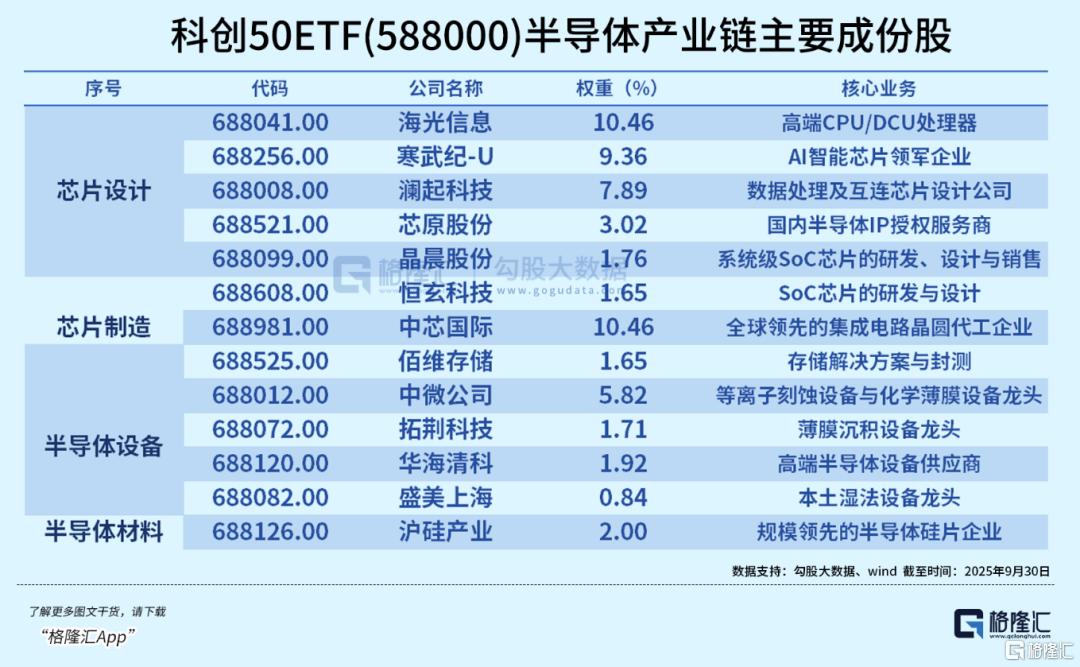 作为成长型的其中一个代表,科创50指数堪称“中国硬科技龙头的集合”,成份股选取科创板市值前50只个股,半导体权重占比高达66.8%,覆盖半导体全产业链,权重股包括寒武纪、海光信息、芯原股份、中芯国际等,深度关联科技自立自强、AI算力需求爆发以及国产替代等最强的趋势。