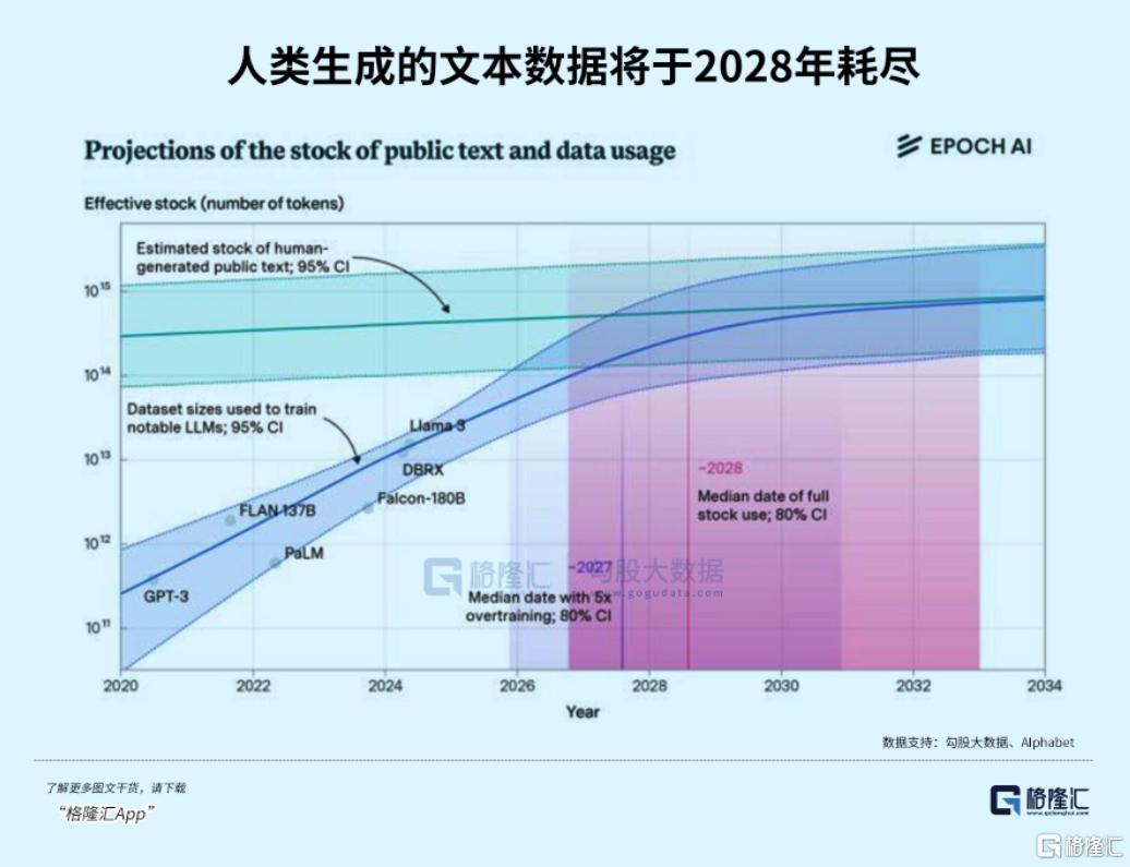 据Epoch AI的研究,高质量的英语文本数据可能在2026年枯竭,到2028年,互联网上所有高质量的文本数据都将被使用完毕。