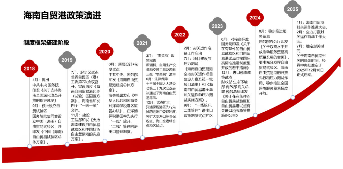 海南的发展同我国改革开放的历程息息相关,1988年4月13日,时任全国人大常委会副委员长的习仲勋,主持了七届全国人大一次会议,决定设立海南省,建立海南经济特区;2020年6月1日,中共中央、国务院印发《海南自由贸易港建设总体方案》;2021年6月10日,十三届全国人大常委会第二十九次会议表决通过了海南自由贸易港法等;2025年7月23日,国家发展改革委副主任王昌林在国新办发布会上表示,党中央批准:海南自贸港封关2025年12月18日正式启动。