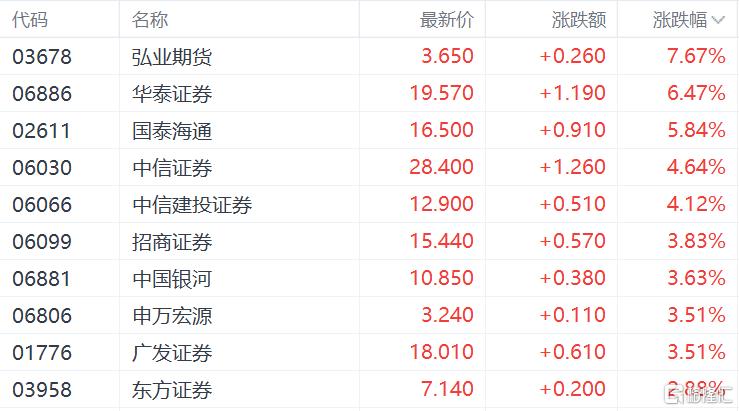 港股市场中,弘业期货涨超7%,华泰证券涨超6%,中信证券、中信建投证券涨超4%,招商证券、中国银河、广发证券跟涨。