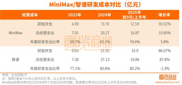 但解决这些问题的前提是,账本上的钱得够烧。过去三年,两家公司合计投入研发资金超过70亿元。MiniMax的研发费用率长期维持在70%左右,智谱则接近80%。
