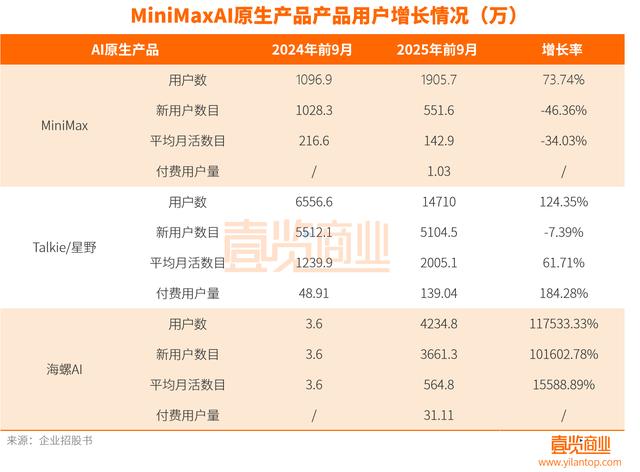 虽然MiniMax的收入大部分源于个人用户,但几个主要产品的核心用户增长指标却有了放缓的迹象。2025年前9个月,MiniMax主应用新用户数增长率同比下降46.36%,Talkie/星野新用户数增长率同比下降7.4%。