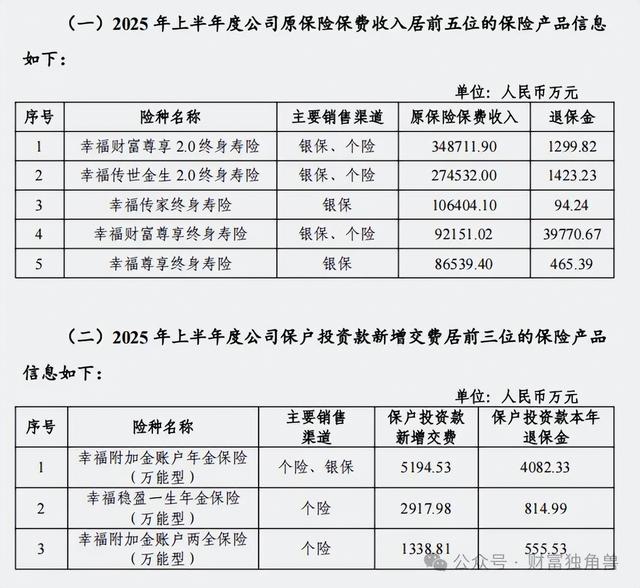 2025年上半年,幸福人寿主要收入仍来自传统寿险等产品,保费前五大产品均为终身寿险。这类产品虽有助于短期内实现规模保费增长,但缺乏健康、养老等长期保障功能,在形成客户黏性上或面临一定挑战。