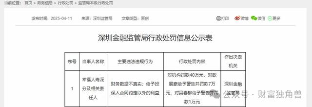 2025年4月11日,深圳金融监管局行政处罚信息公示表显示,幸福人寿深分及相关责任人因“财务数据不真实;给予投保人合同约定以外的利益”,深圳金融监管局对该机构罚款40万元。