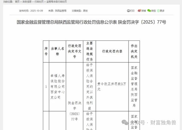 进入2025年以来,幸福人寿多地分支机构被监管部门予以行政处罚。就在2025年10月9日,根据国家金融监督管理总局陕西监管局行政处罚信息公示表(陕金罚决字〔2025〕77号)显示,幸福人寿保险股份有限公司西安中心支公司,因“给予投保人保险合同约定以外其他利益”,被国家金融监督管理总局陕西监管局责令改正并罚款5万元。