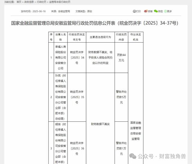2025年6月16日,根据国家金融监督管理总局安徽监管局行政处罚信息公开表(皖金罚决字〔2025〕34-37号)显示,幸福人寿保险股份有限公司安徽省分公司因“财务数据不真实、给予投保人保险合同约定以外的利益”,被国家金融监督管理总局安徽监管局罚款44万元。