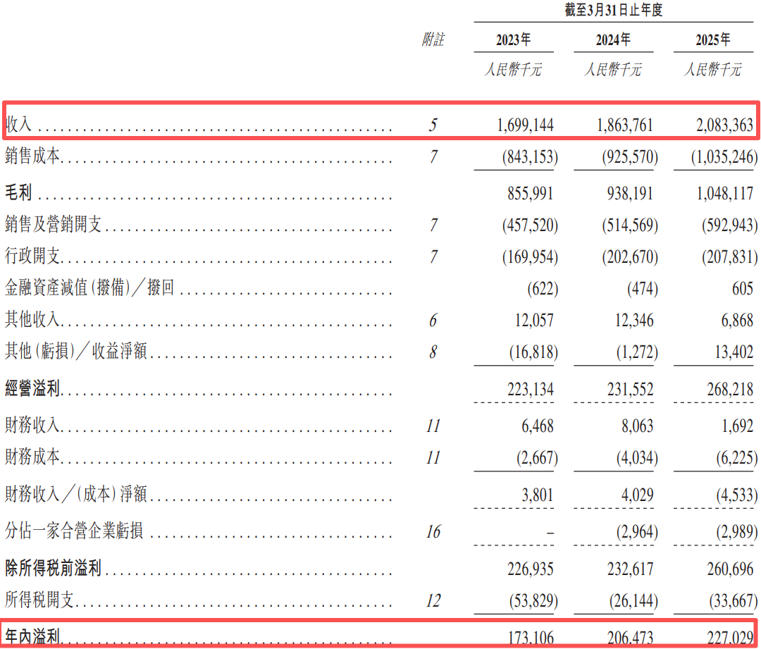 招股书显示,2023至2025财年,公司分别录得收入16.99亿元、18.64亿元及20.83亿元,同期净利润分别为1.73亿元、2.06亿元及2.27亿元。