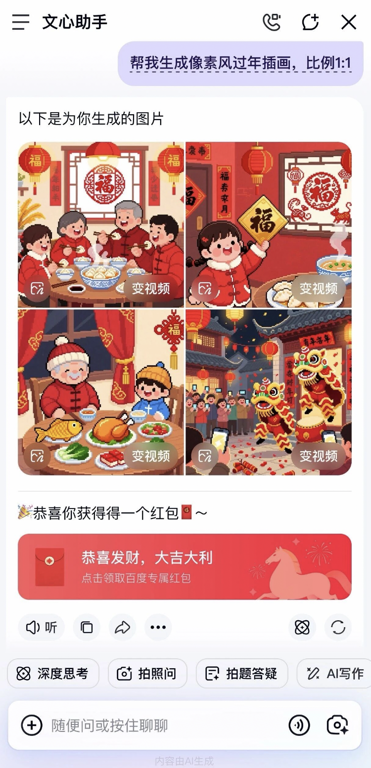除此之外,百度此次的AI生态建设还表现在,百度App将作为首席AI合作伙伴合作《2026北京广播电视台春节联欢晚会》,同时上线近百种春节主题AI玩法。具体涵盖边看视频边领钱、集卡赢万元现金、AI春联创作、AI写真、AI相机、AI测运势、AI夸夸等,覆盖用户春节期间的各类场景需求。值得一提的是,百度App 将以“奇幻人生”为主题,上线近200款AIGC创作玩法,用户一键即可制作专属马年奇幻大片。