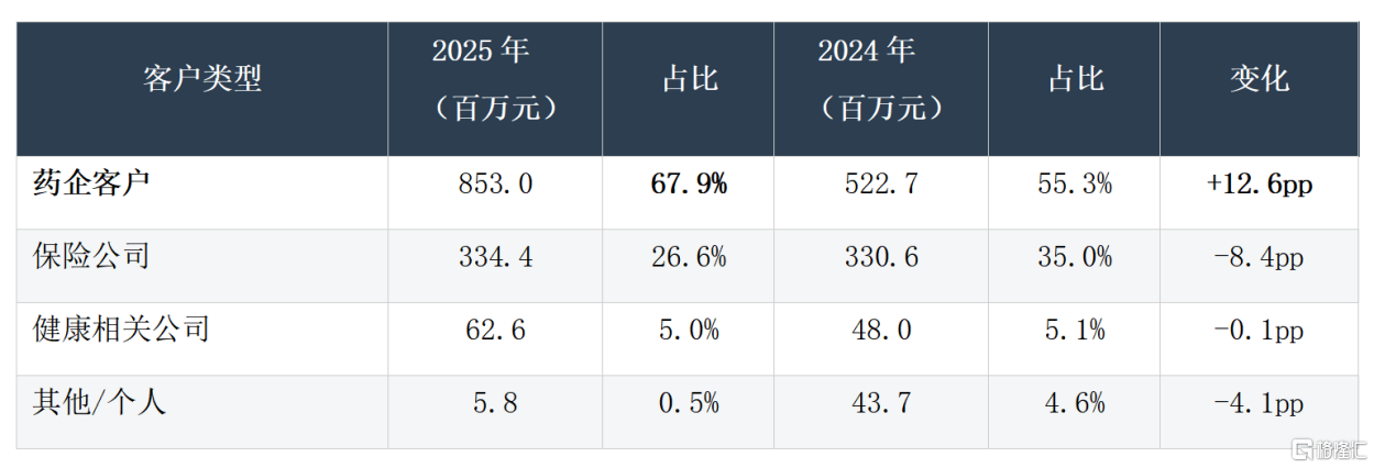从数据对比能清晰看出,2025年药企客户收入贡献比例较2024年大幅提升12.6个百分点,坐稳核心付费群体位置。保险公司收入规模几乎持平,但占比下滑明显,从35.0%降到了26.6%。