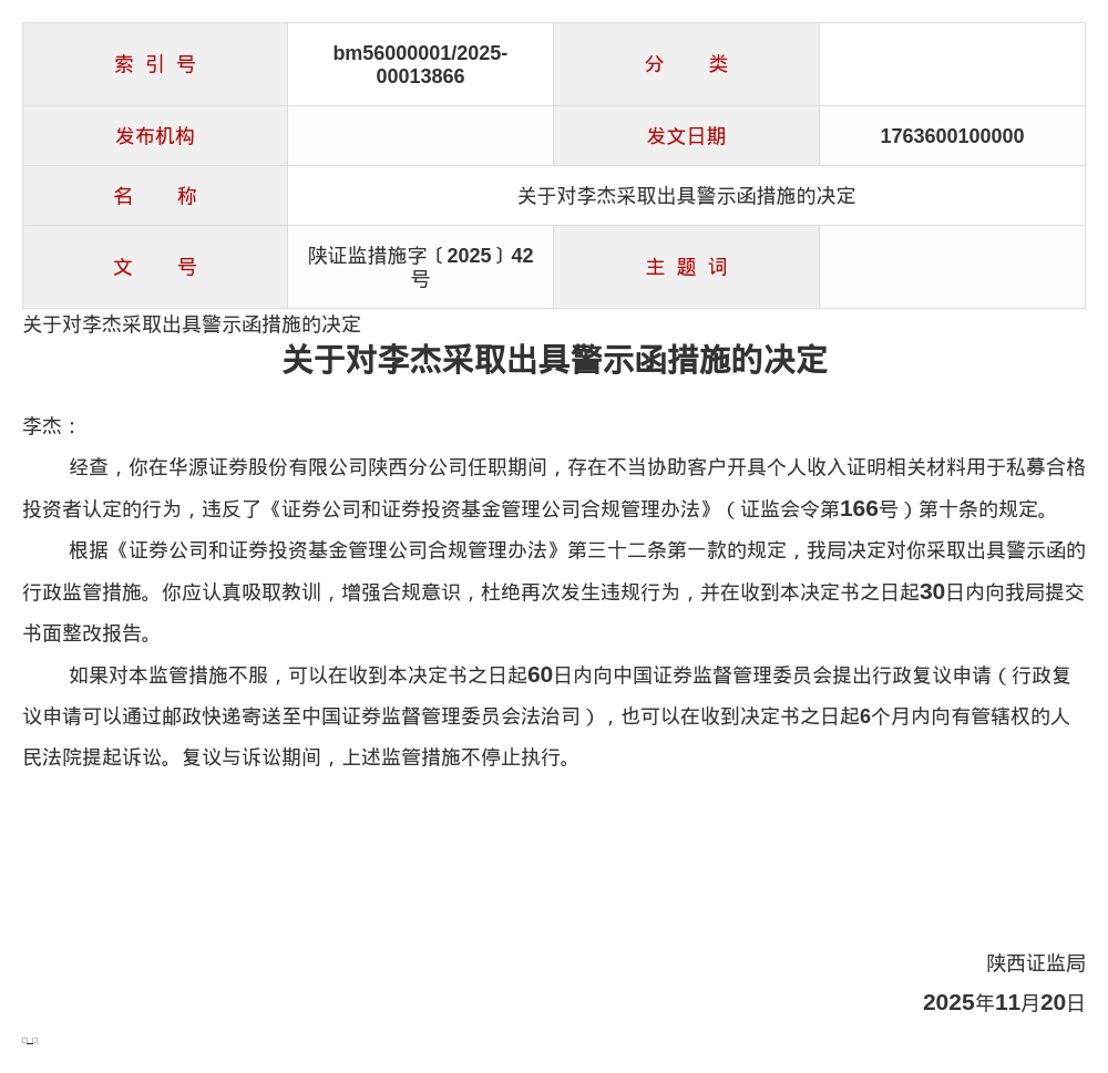 因此,陕西证监局决定对李杰采取出具警示函的行政监管措施,并在收到本决定书之日起30日内提交书面整改报告。