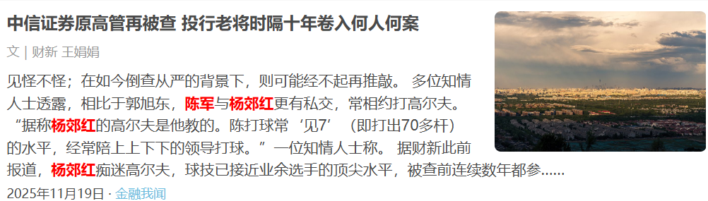 据今日消息,多位知情人士向财新透露,陈军与在证监会工作了18年的杨郊红私交甚密,经常约着一起打高尔夫。