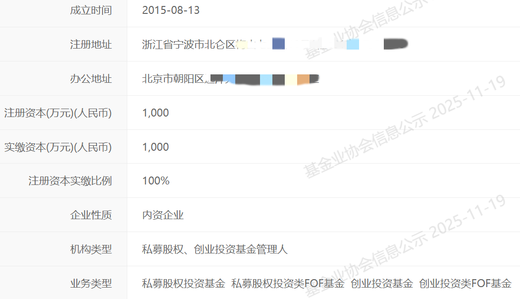 尽管注册地在宁波,但中国证券投资基金业协会的信息显示其实际办公地点位于北京。