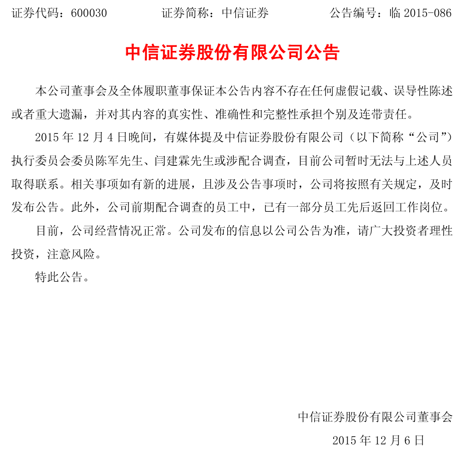 2015年12月6日晚,中信证券公告称,公司执行委员会委员陈军、闫建霖暂时失联。有媒体称两人当时正在协助调查。