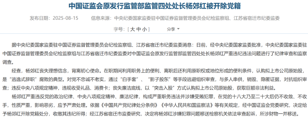 今年8月,江苏省宿迁市纪委监委通报,中国证监会原发行监管部监管四处处长杨郊红被开除党籍。