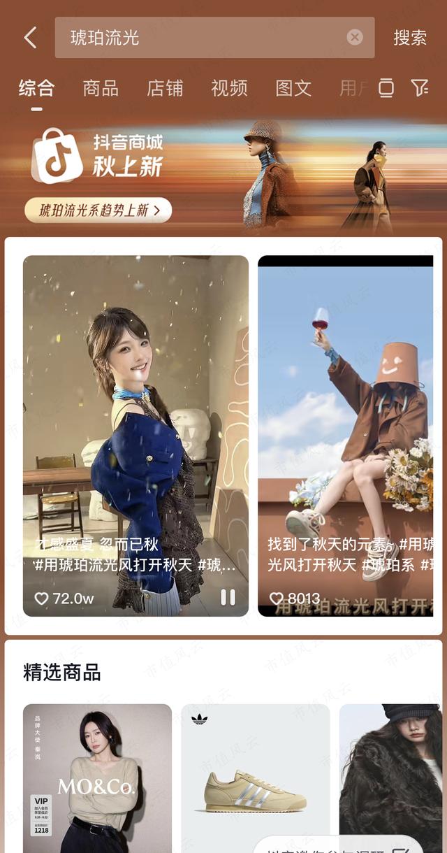 数据显示,8月31日至9月27日期间,“琥珀流光”话题在抖音总曝光量超100亿。品牌服饰、彩妆整体成交额同比与环比增长均超过30%,60余个品牌成交额突破亿元,超100个单品成交额破千万元。在此期间,新品上新数量达3300万个,环比增长60%,其中超1500款新品的成交额突破百万元。