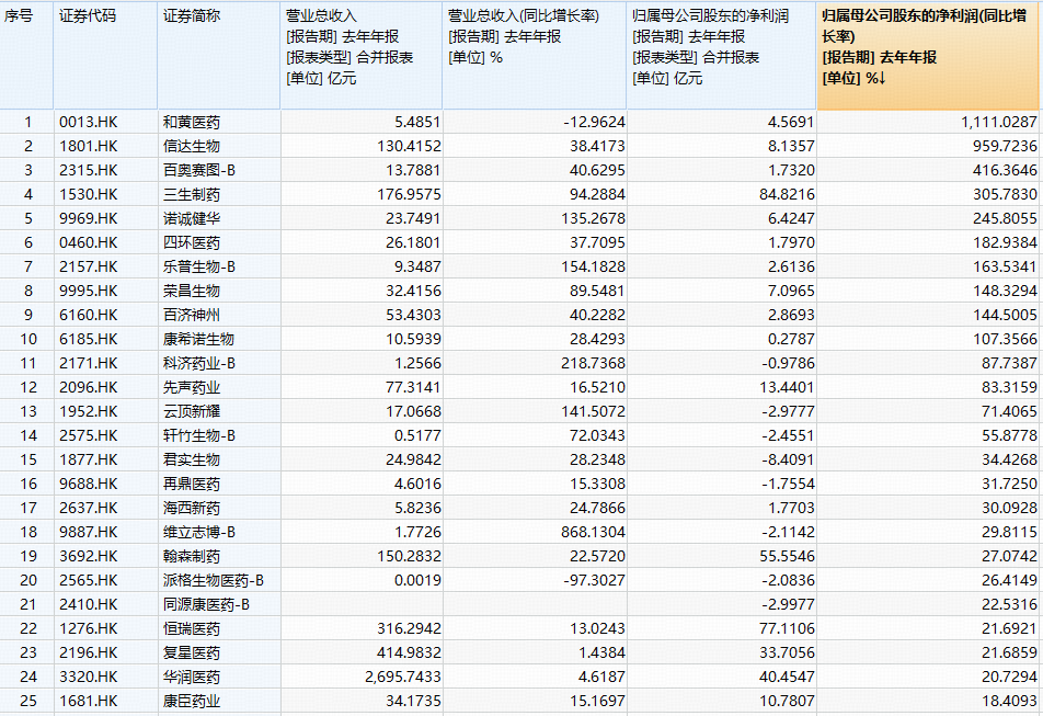 其中净利翻倍增长成份股多达10只:和黄医药净利同比暴增超11倍,信达生物增超9倍,百奥赛图-B、三生制药、诺诚健华、四环医药、乐普生物-B、荣昌生物、百济神州、康希诺生物净利同比增速均超100%!