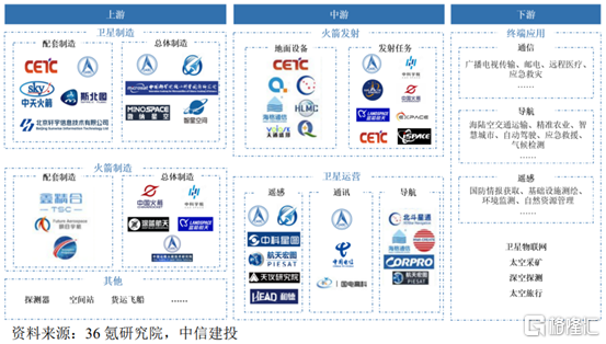 中游为火箭发射与卫星运营服务厂商,其中,卫星运营服务商进一步分为遥感、通讯与导航三类。相关企业有海格通信、中国火箭、中科星图、航天宏图、北斗星通、航天科技、蓝箭航天、星际荣耀等。