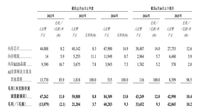 根据招股书,2022年到2024年,内存模组毛利率分别为5.9%、11.1%、8.7%。2025年上半年,内存模组毛利率3.9%,同比减少1.6个百分点。