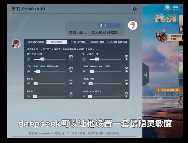 过去NPC大多为固定应答,接入DeepSeek后,《和平精英》上线的数字代言人“吉莉”可以根据你的提问,提供“千人千面”的解答。同时,“吉莉”还集成了游戏内容,玩家可以通过提问来获取包括武器搭配、战术策略等深度内容。