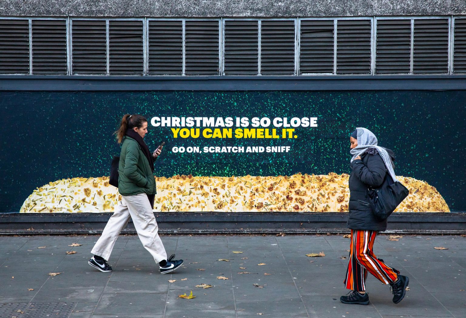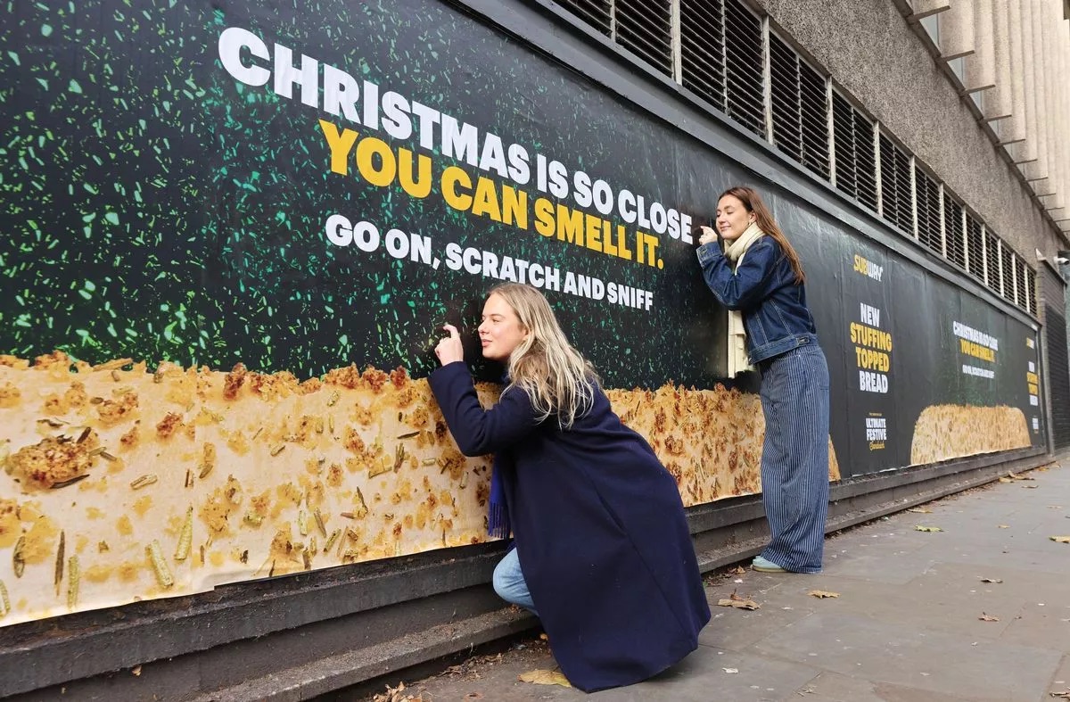 以快餐品牌赛百味Subway为例,其在伦敦市中心投放了一块长约15米的“刮刮闻”广告牌,该装置以品牌新推出的鼠尾草洋葱馅面包为灵感,通过实验室调配分子香氛,并将其微胶囊化后覆于广告表面。路人经过时,不仅能看到放大的面包视觉,还能闻到接近真实烘焙的气味。