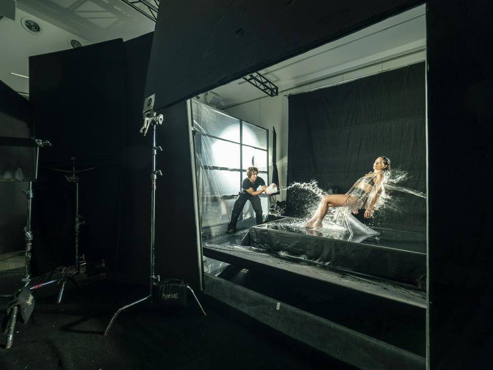 Sølve Sundsbø回忆道:“创作初期,我们会问,‘风应该怎么呈现?’风是无形的,唯有通过物体的被吹拂才能显形。水是包覆,也是冲击。我不希望它们只是背景,而是成为人物身体与情感的一部分。”因此,倍耐力年历并未采用户外实景,而是在摄影棚内精准设计每一个元素与灯光条件,确保人物在其中既保持美感,也真实可感。
