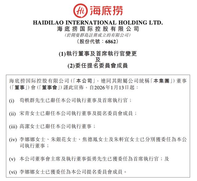 1月13日晚,海底捞发布公告称,现任CEO苟轶群辞任,创始人张勇回归一线;与此同时,宋青、高洁辞任执行董事,李娜娜、朱银花、焦德凤及朱轩宜四位集团内部核心岗位高管入局董事会,新管理格局正式成型。受此影响,海底捞股价1月14日大涨9.15%。