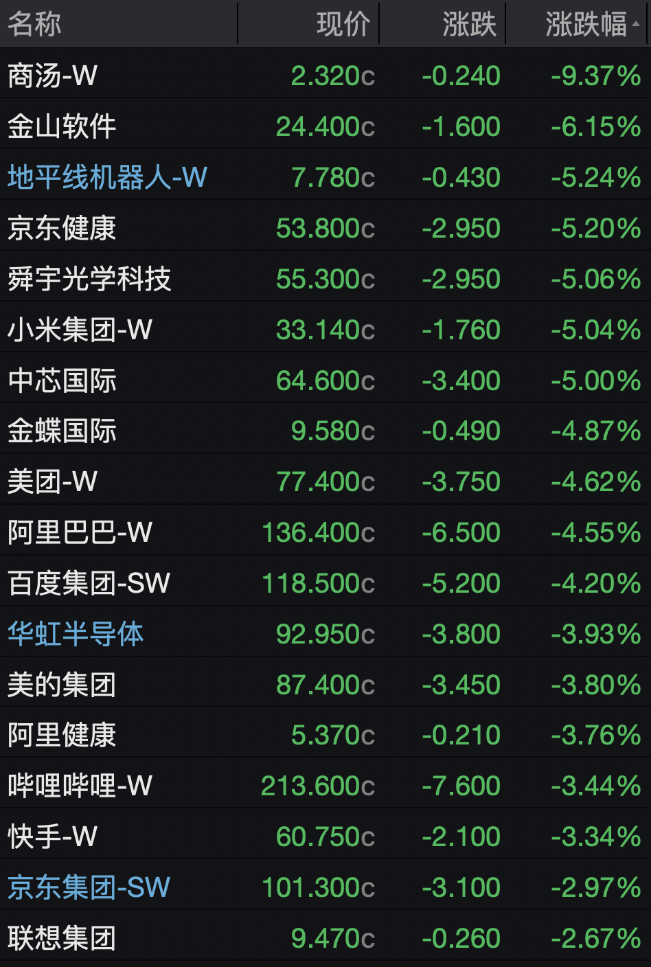 大型科网股重挫,商汤跌逾9%,金山软件跌逾6%,京东健康、小米集团等跌超5%,中芯国际跌5%,美团、阿里巴巴、百度集团均跌超4%,哔哩哔哩、快手、京东集团、联想集团均下跌。