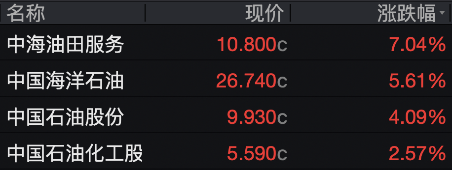 石油股逆势走强,中海油田服务涨超7%,中国海洋石油涨逾5%,中国石油股份涨逾4%。