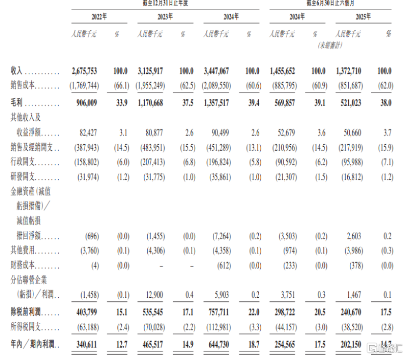 得益于推出新产品,加大市场营销及广告宣传力度,以及努力拓展线上线下的直销网络,公司产品销量增加,2023年及2024年收入同比增长。但受季节性因素影响,以及不同年份的农历新年时间不同,2025年上半年公司收入同比下滑。