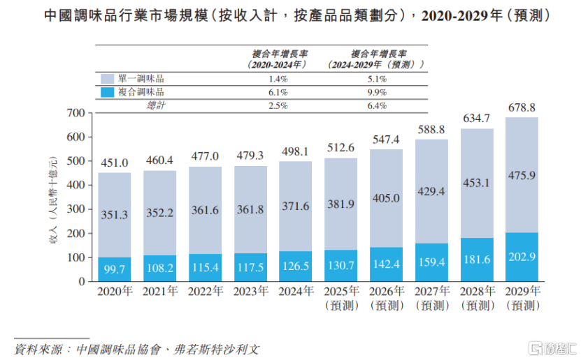2024年中国调味品行业的市场规模达到4981亿元,受人均可支配收入增加、城镇化率提升、调味品品类多元化及销售渠道拓展等推动,预计到2029年将扩大至6788亿元,2024年至2029年的复合年增长率为6.4%。