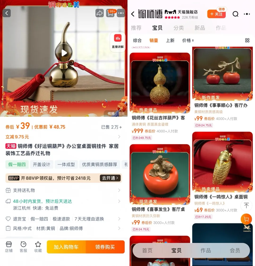 招股书指出,铜师傅的定价基于质价比原则,强调每件产品的艺术、文化和材料价值,同时确保广泛的消费者可及性。其官方旗舰店中,产品售价多分布在几十到四万元之间,其中最便宜的是一款标价39元的铜葫芦挂件。而其同赛道的竞对品牌朱炳仁·铜则整体定价更高些,售价最高的铜质产品接近10万。