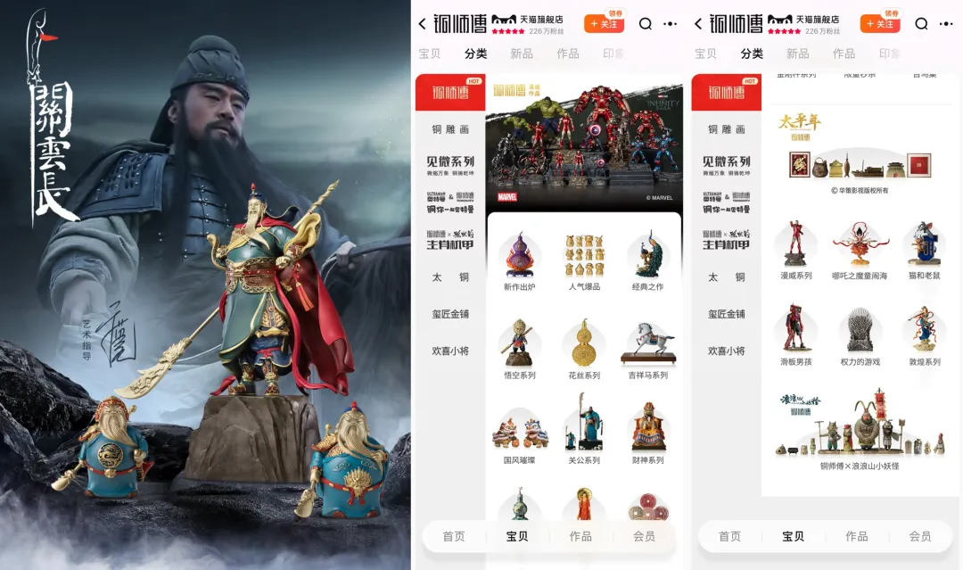 不过,亲民的产品定价和优良的工艺也是品牌引以为傲的优势之一。一个广为流传的故事是,创始人俞光在2013年成立铜师傅,当时他有感于自己购买的铜质关公像售价高达120万,而铜的市场价仅数万元一吨。在当时,铜制工艺品普遍有品类无品牌,俞光将失蜡铸铜法工艺与文化创意结合,以价格优势很快打开了市场。
