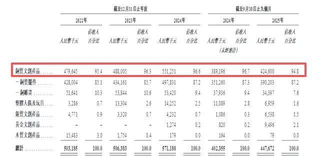 在铜质文创工艺品赛道里,铜师傅把生意做到了塔尖上。根据弗若斯特沙利文报告,2024年铜师傅在中国铜质文创工艺产品市场按总收入计位列第一,市场份额为35.0%。这家公司在过去几年里保持着5-6亿的年营收,其中最热门的IP是葫芦、大圣、关公、财神、佛祖等——品牌受众形象及心理需求可见一斑。