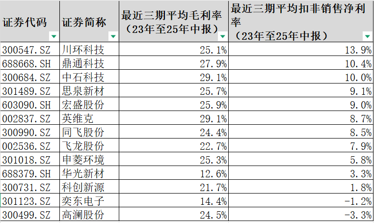 从最近3年的扣非归母净利润成长性来看,宏盛股份、飞龙股份、科创新源、英维克的成长性都在100%以上,第二梯队的川环科技、华光新材、中石科技、同飞股份成长性在40%以上;