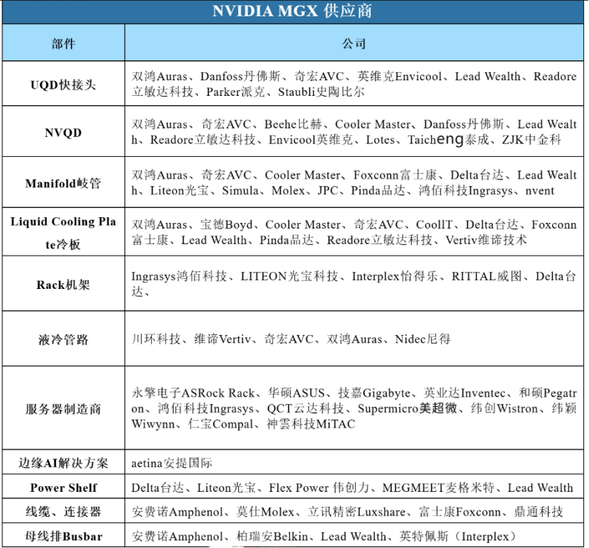 国内企业可以通过“直接+间接”路径突破,如下英伟达MGX 生态的供应商分工表所示,能看到国内企业的突破:比如英维克进入了UQD快接头、NVQD的供应商名单,川环科技在液冷管路板块入围,以及领益智造拟收购股权的立敏达也在列,还有飞龙股份通过台达、CoolerMaster、维谛(Vertiv)、兴奇宏以及申菱环境、英维克等间接供货终端客户;