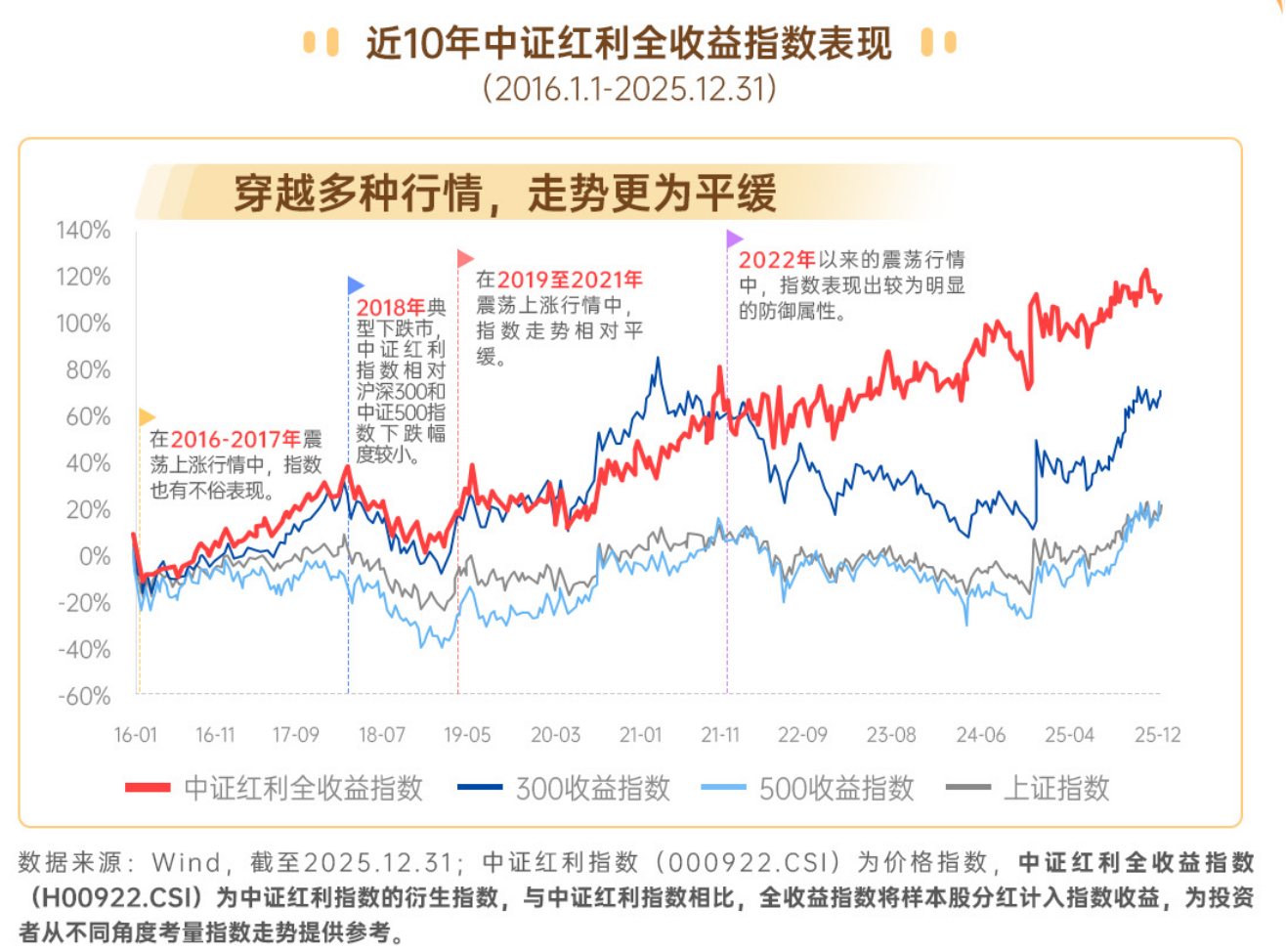 从历史表现看,中证红利全收益指数在熊市和震荡市中往往能跑赢大盘。以2022年为例,沪深300下跌超20%,中证红利全收益指数仅小幅回撤。其底层逻辑在于:高股息资产提供了确定性的现金回报,在利率下行环境中,这种“类债券”属性使其估值具备支撑。