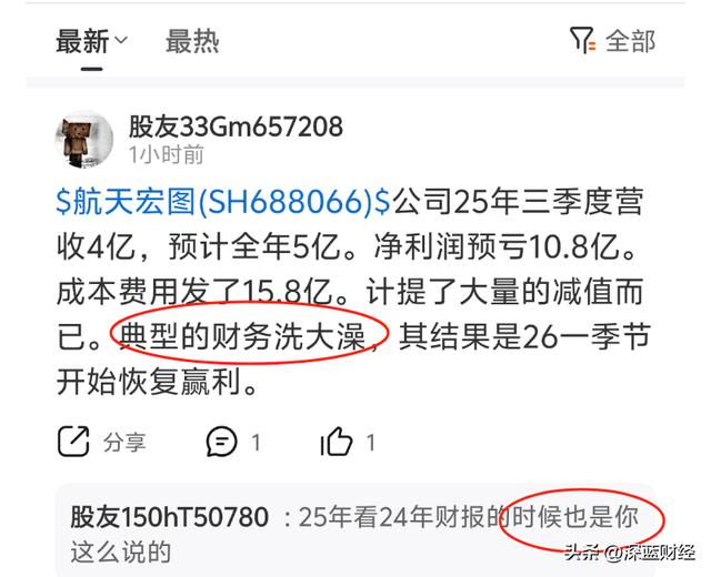 关于业绩亏损,也有股民认为这是“典型的财务洗大澡”,不过该观点也遭遇了其他股民的呛声。