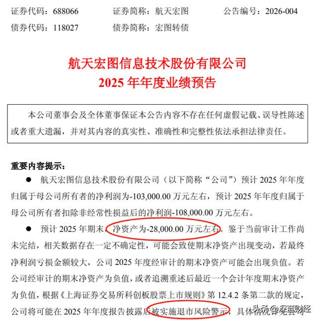 1月31日,上市公司航天宏图发布全年业绩预告,公司预计2025年度归母净利润为-10.3亿元左右;预计扣非后归母净利润为-10.8亿元左右;预计2025年期末净资产为-2.8亿元左右。